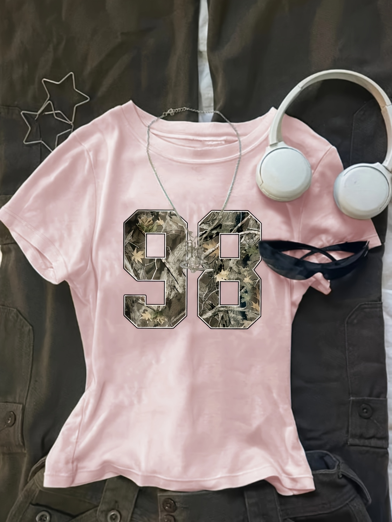 Women'S Camo Print T-Shirt with "98" Design - Casual Short Sleeve Crew Neck Top, Light Yellow, Spring & Summer Fashion, Casual Wear|Camouflage Print|Lightweight Fabric