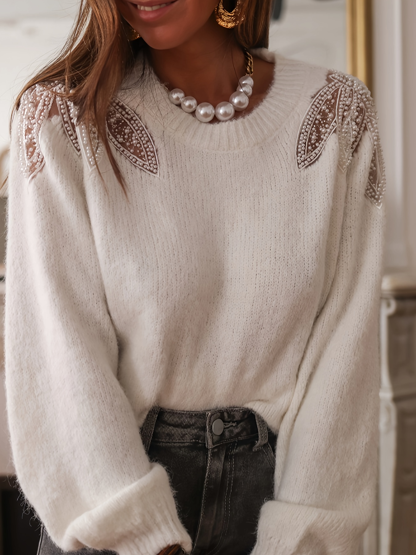 Women's Casual Chic Lace-Trimmed Long Sleeve Sweater with Bow Detail at Back - Soft Round Neck Pullover, Medium Stretch Autumn Winter Top for Casual Attire, Cute Sweaters