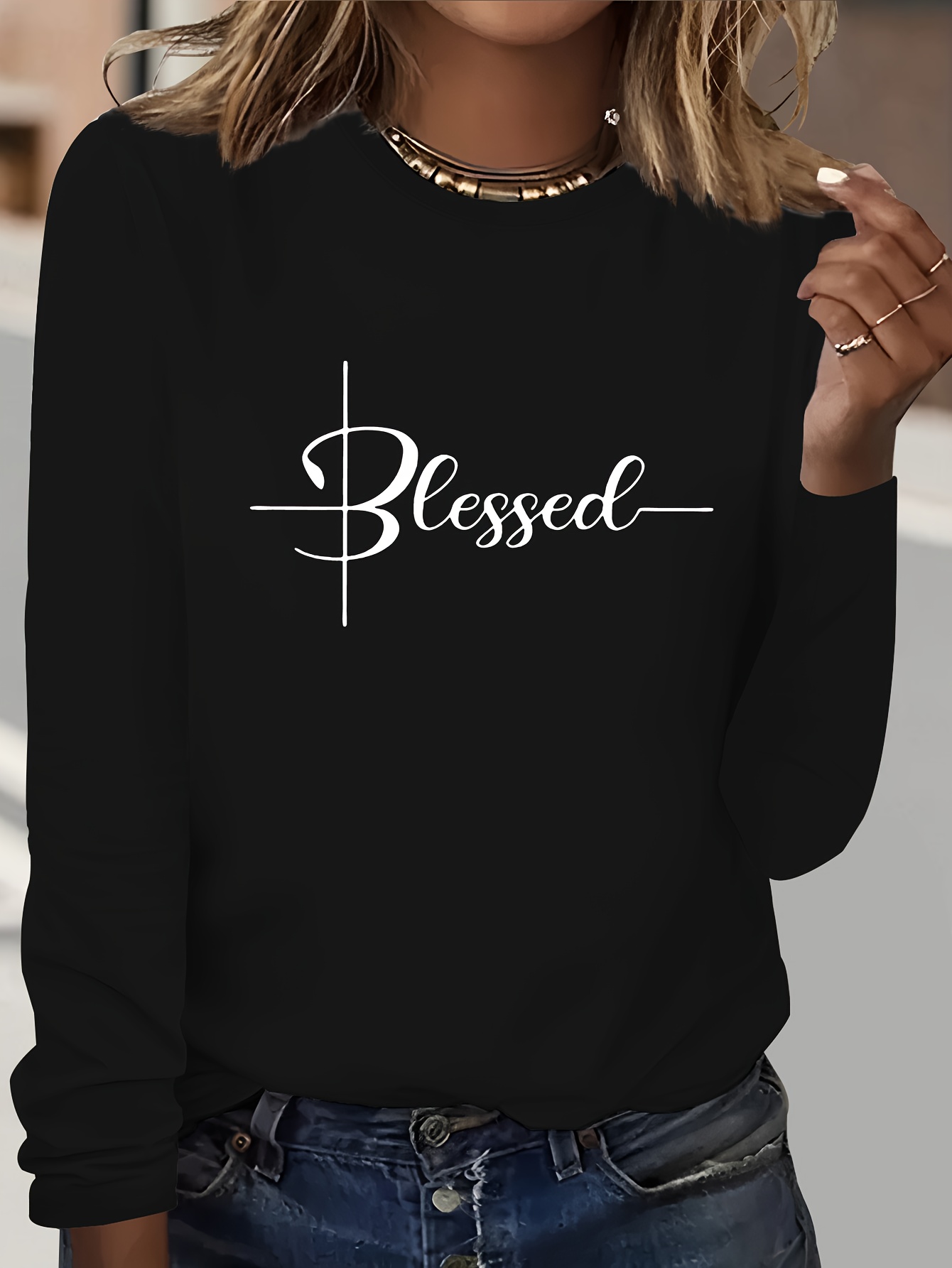 Chic Geometric Print Long Sleeve T-Shirt for Women - Casual Crew Neck, Soft Polyester, Perfect for Fall & Winter