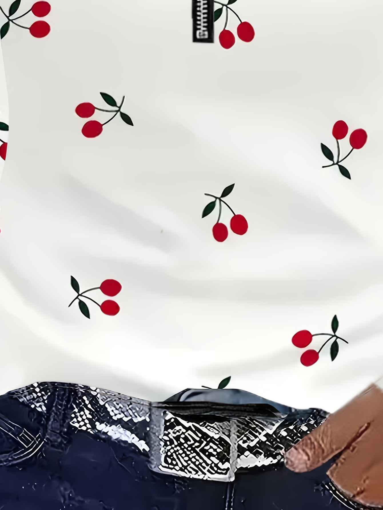 [Elegant Cherry Print T-Shirt] Elegant Women's Cherry Print Long Sleeve T-Shirt | Back Zipper, White with Red Cherry & Black Leaf Design, Round Neck Spring/Fall Layering Top, Regular Fit Casual to Semi-Formal Blouse