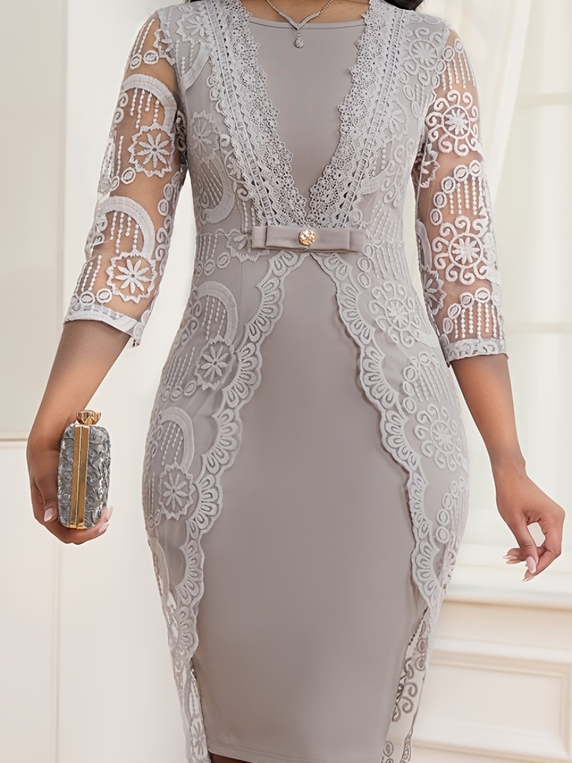 Elegant Dark Gray Lace-Trimmed Midi Dress with 3/4 Sleeves and V-Neck - Slim Fit, Flared Skirt, Zipper Detail, Perfect for All Seasons, Formal Attire|Sleek Fitted Top|Zippered Dress