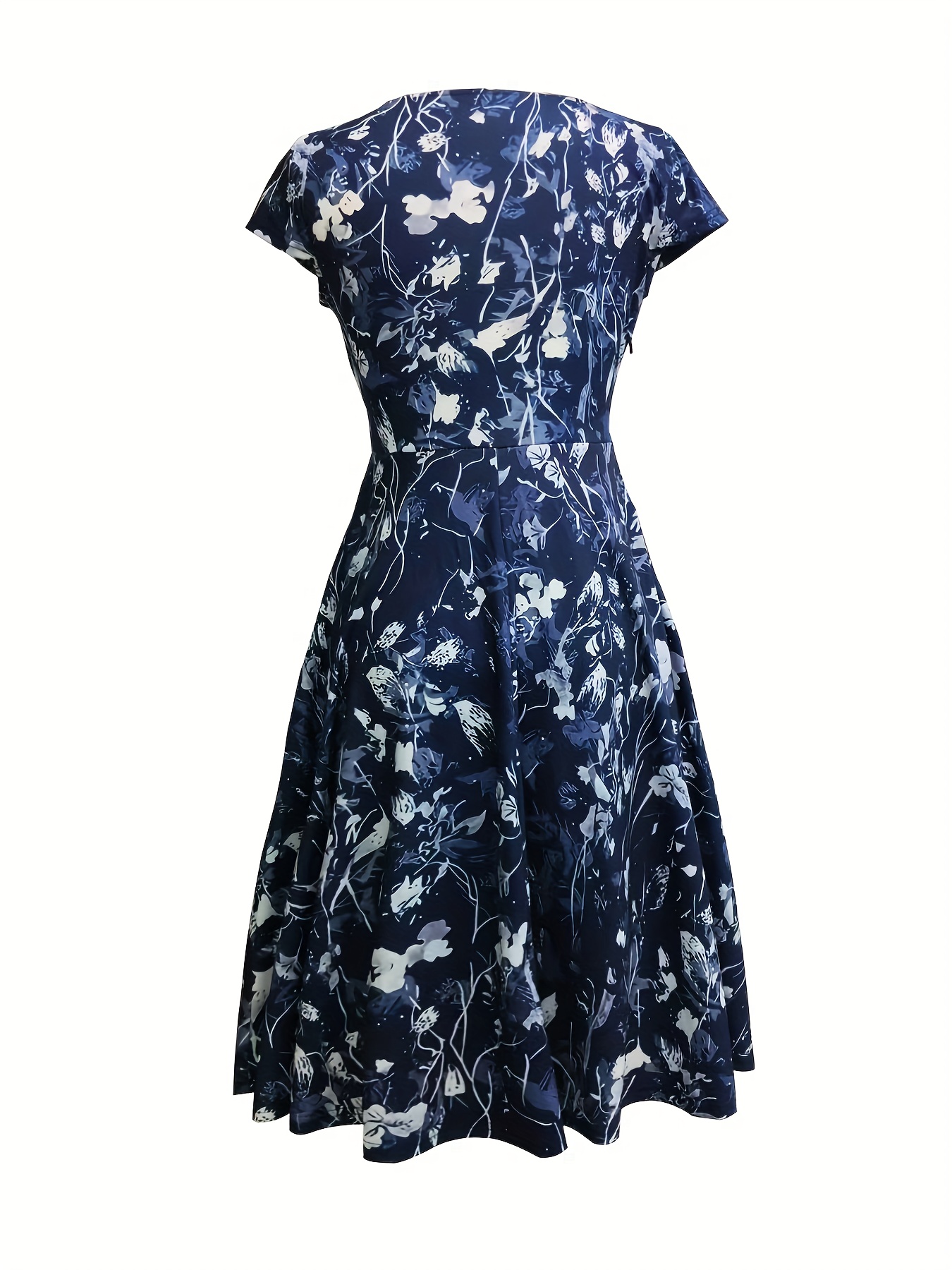 [Navy Blue Floral Dress] Polyester Blend Women's Navy Blue Floral Print V-Neck Midi Dress with Short Sleeves and Pockets | Casual Dress, Floral Print Dress, Perfect for Spring, Summer, and Fall