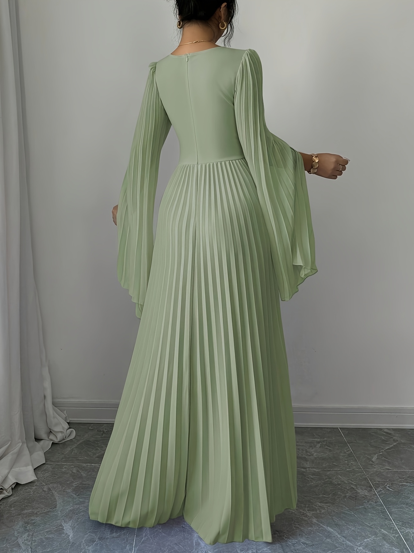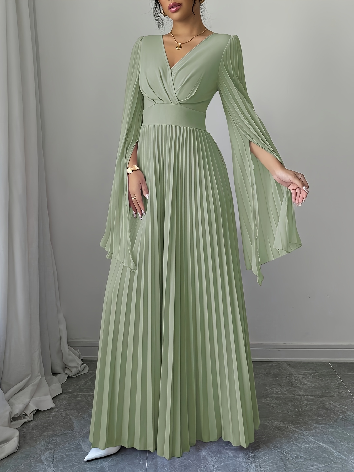 Women's Elegant Long-Sleeve V-Neck Pleated Maxi Dress with Slit for Spring/Summer
