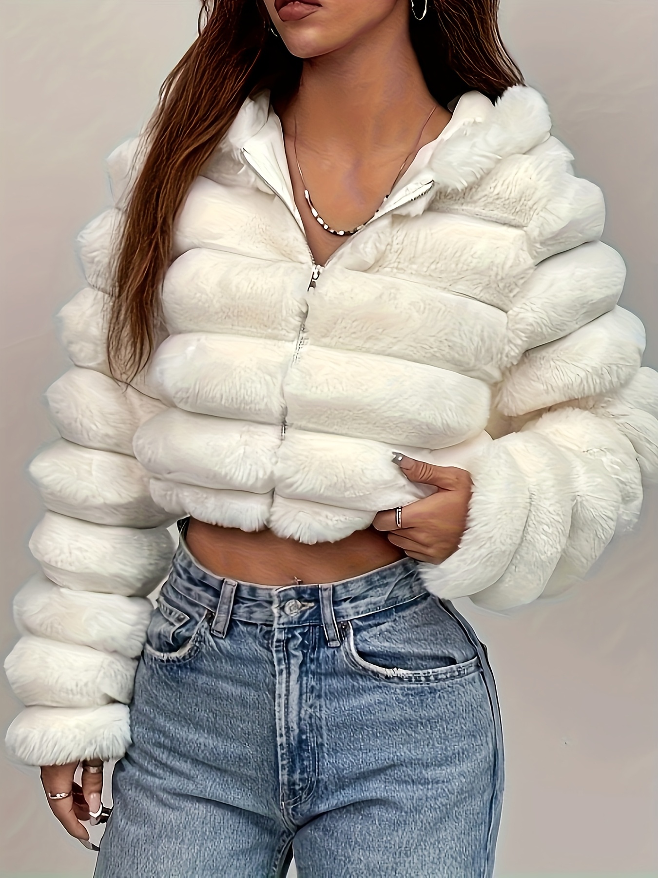 Women'S Elegant White Faux Fur Hooded Jacket - Zip-Up Mid-Length Winter Coat with Puffy Sleeves, Perfect for Fall & Winter, Stylish Layering Piece, Winter Coat