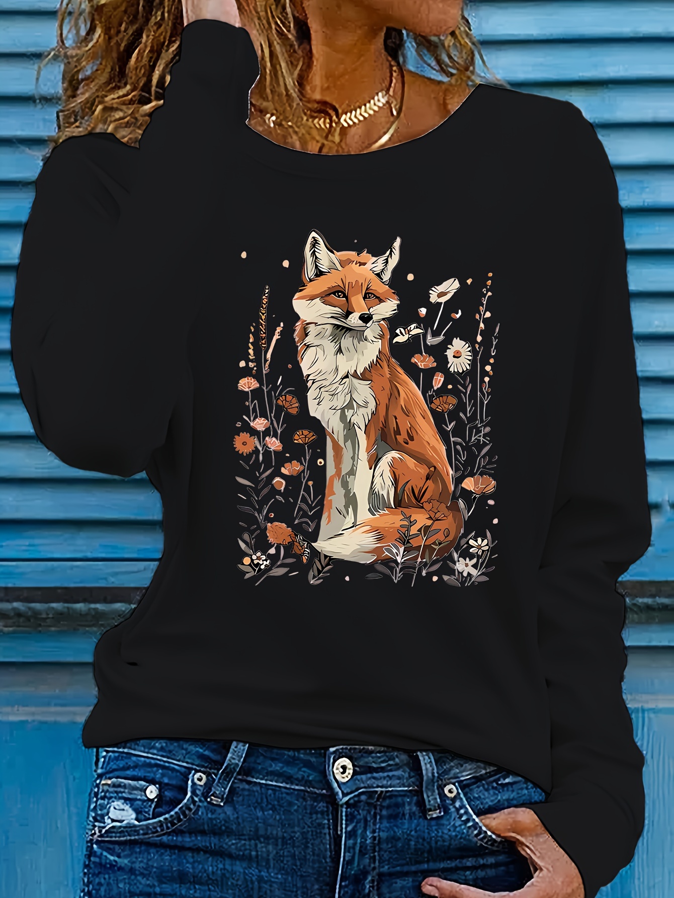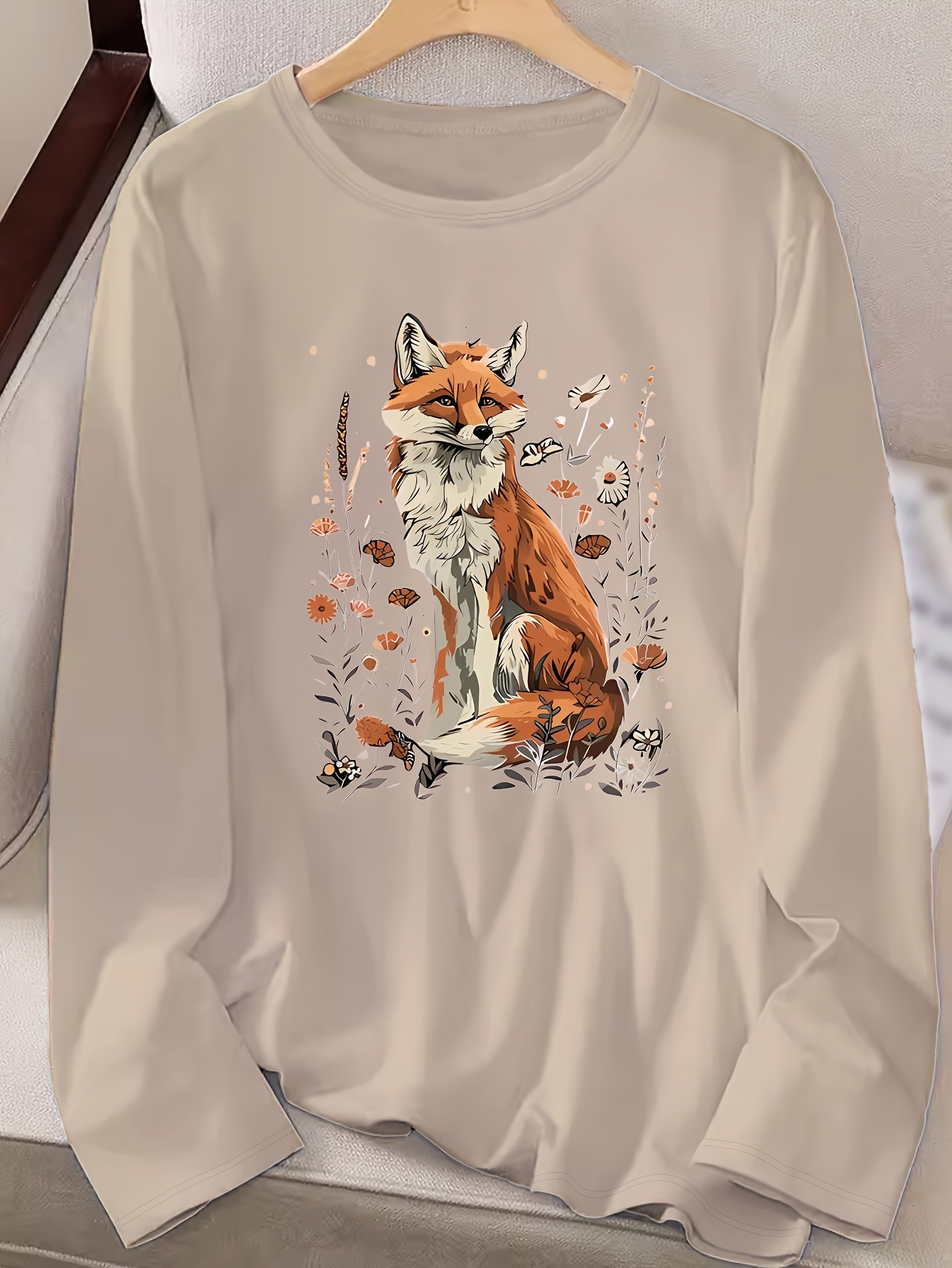 Women's Fox & Floral Graphic Print Long Sleeve T-Shirt - Soft Stretch Crew Neck Casual Top for Spring & Fall, Machine Washable Regular Fit, Medium Elasticity Shirt