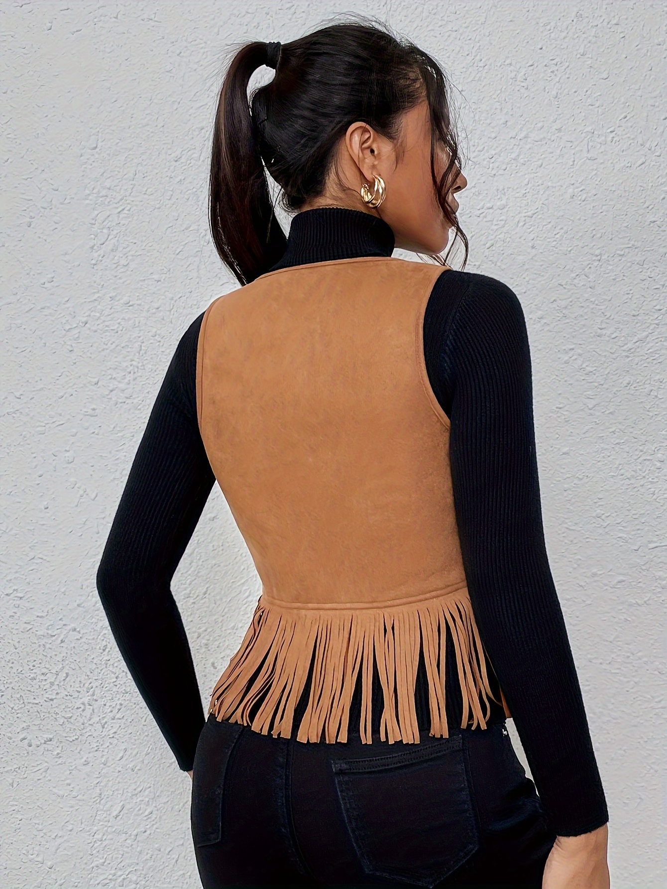 [Elegant Vest] Elegant Tassel Sleeveless Vest Jacket | Women's Medium Stretch Suede-Like Fabric, Adjustable Waist Tie & Fringe Hem, All-Season Versatile Layering Piece for Casual or Formal Outfits, Smooth Texture Finish