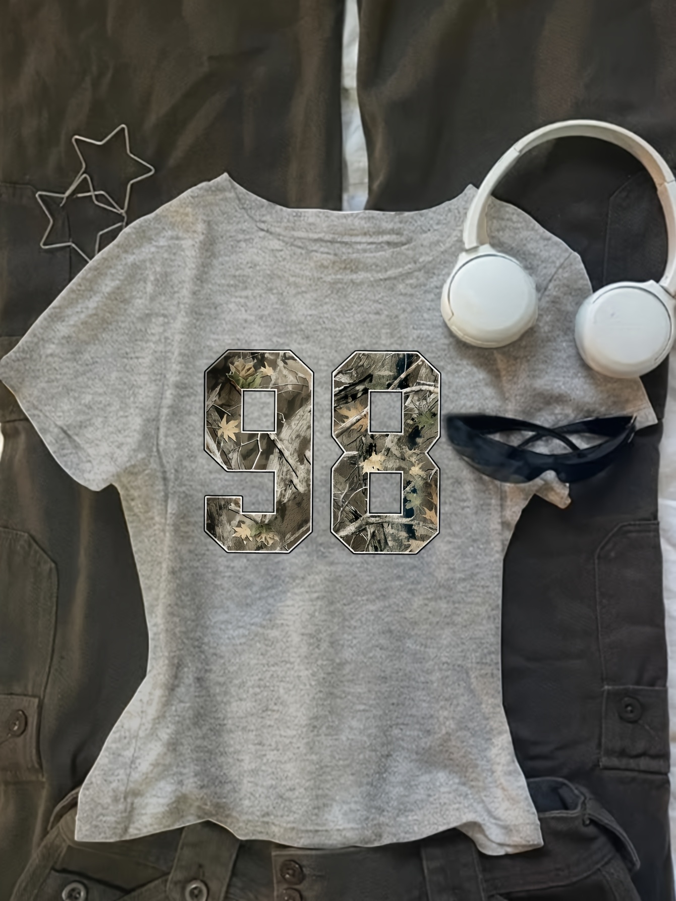 Women'S Camo Print T-Shirt with "98" Design - Casual Short Sleeve Crew Neck Top, Light Yellow, Spring & Summer Fashion, Casual Wear|Camouflage Print|Lightweight Fabric