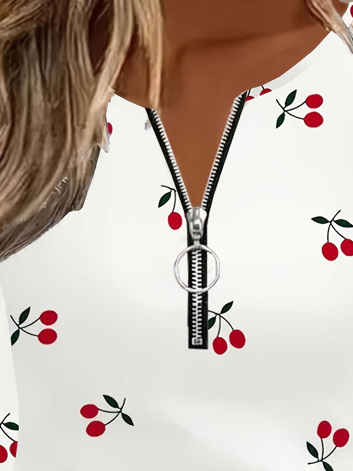 [Elegant Cherry Print T-Shirt] Elegant Women's Cherry Print Long Sleeve T-Shirt | Back Zipper, White with Red Cherry & Black Leaf Design, Round Neck Spring/Fall Layering Top, Regular Fit Casual to Semi-Formal Blouse
