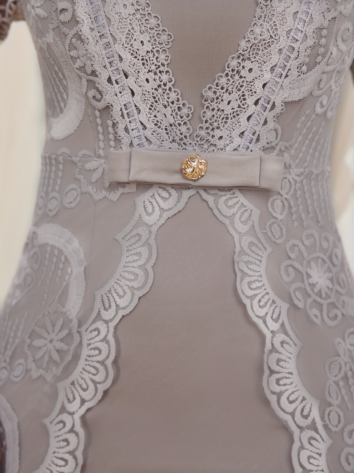 Elegant Dark Gray Lace-Trimmed Midi Dress with 3/4 Sleeves and V-Neck - Slim Fit, Flared Skirt, Zipper Detail, Perfect for All Seasons, Formal Attire|Sleek Fitted Top|Zippered Dress