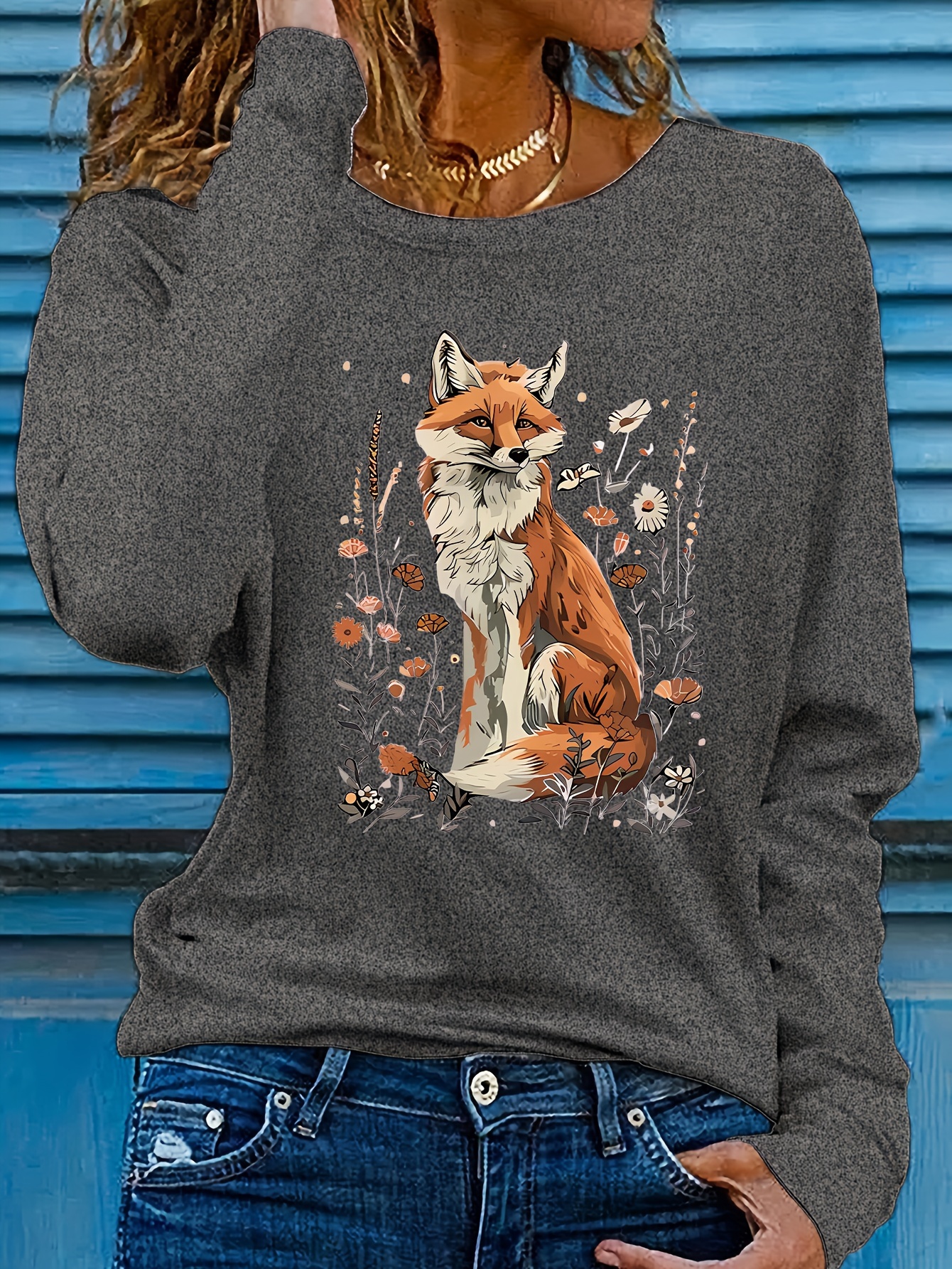 Women's Fox & Floral Graphic Print Long Sleeve T-Shirt - Soft Stretch Crew Neck Casual Top for Spring & Fall, Machine Washable Regular Fit, Medium Elasticity Shirt